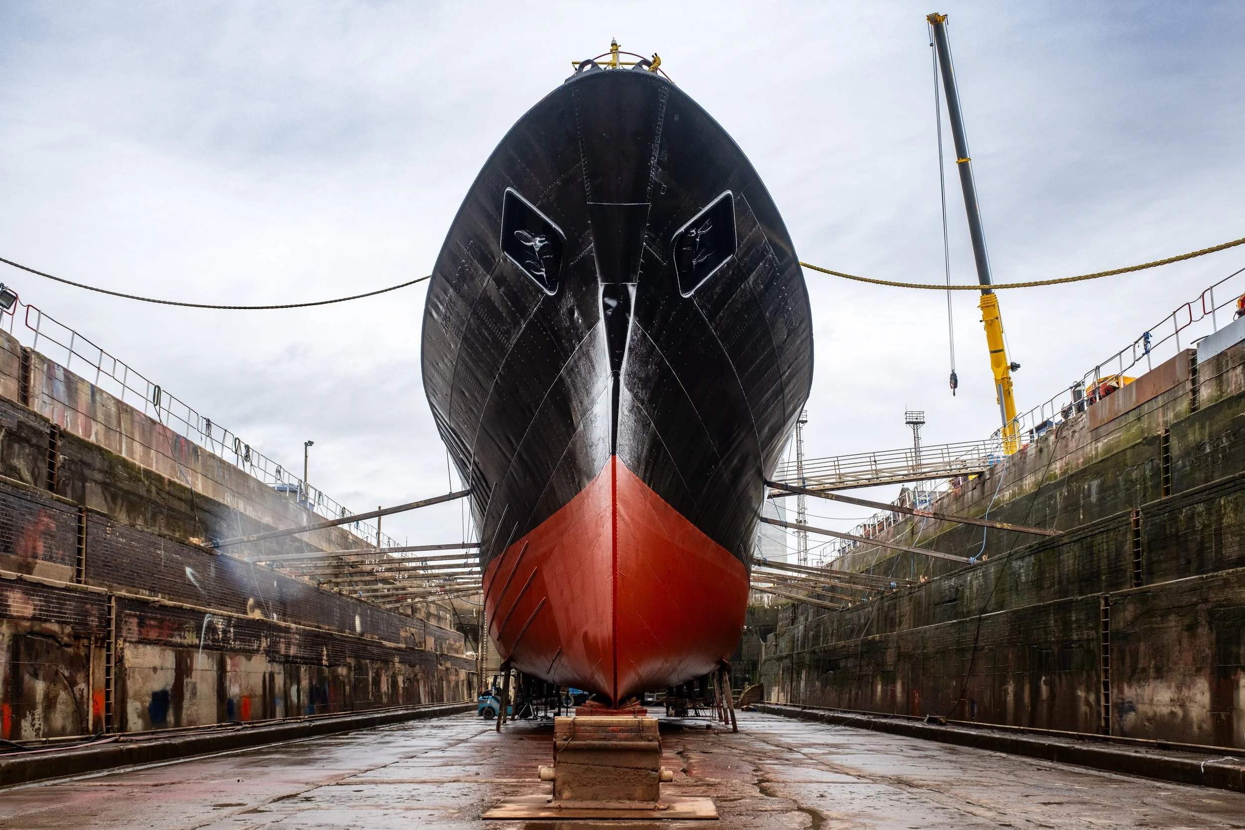 The Arctic Corsair has been painted with two top coats of paint and six docking brackets have been fitted in preparation for its berthing at her new dry berth at North End Shipyard in early 2024.