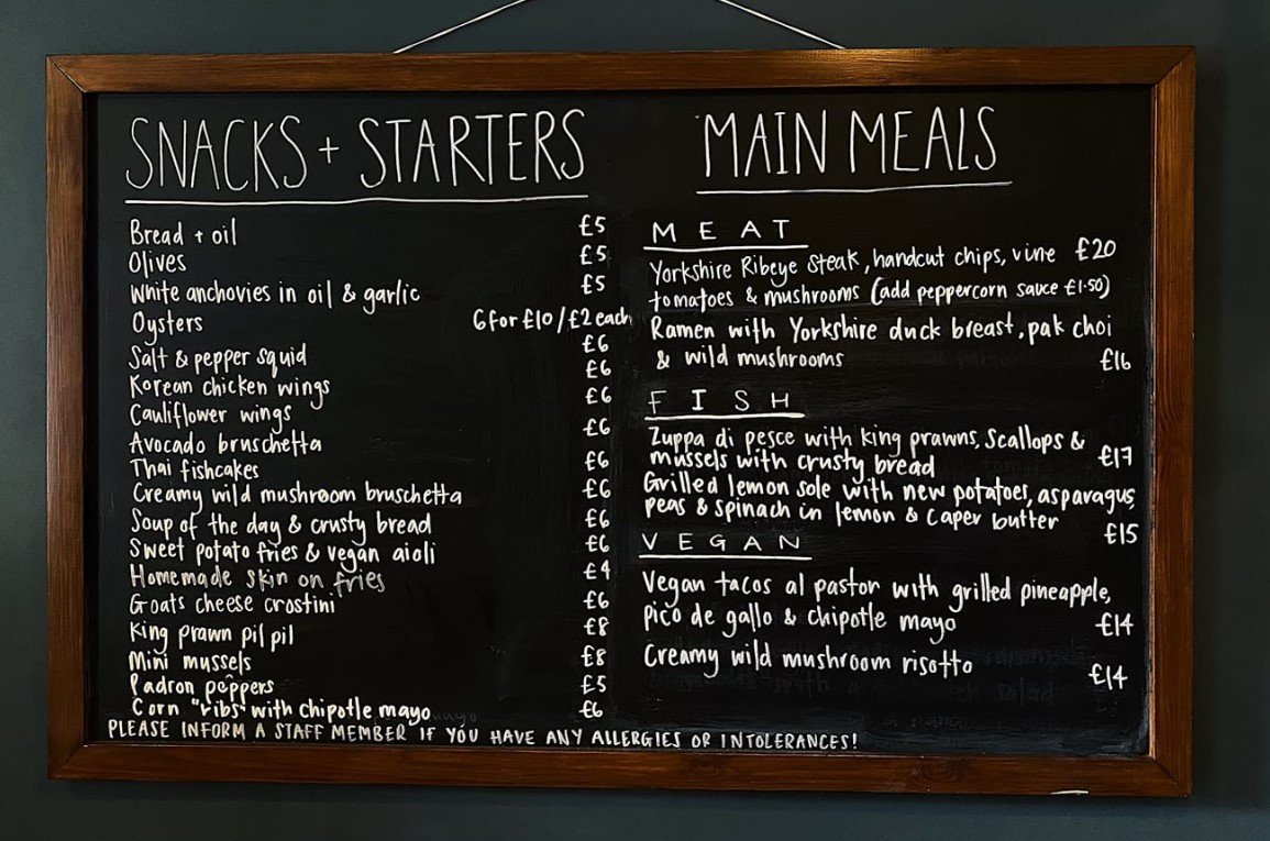 There are also blackboards – loads of them – displaying the main menu which changes every fortnight and always comprises mains of two meat, two fish and two vegan. There’s also a long list of very tempting snacks and starters as well as a build-your-own brunch and lunch board.