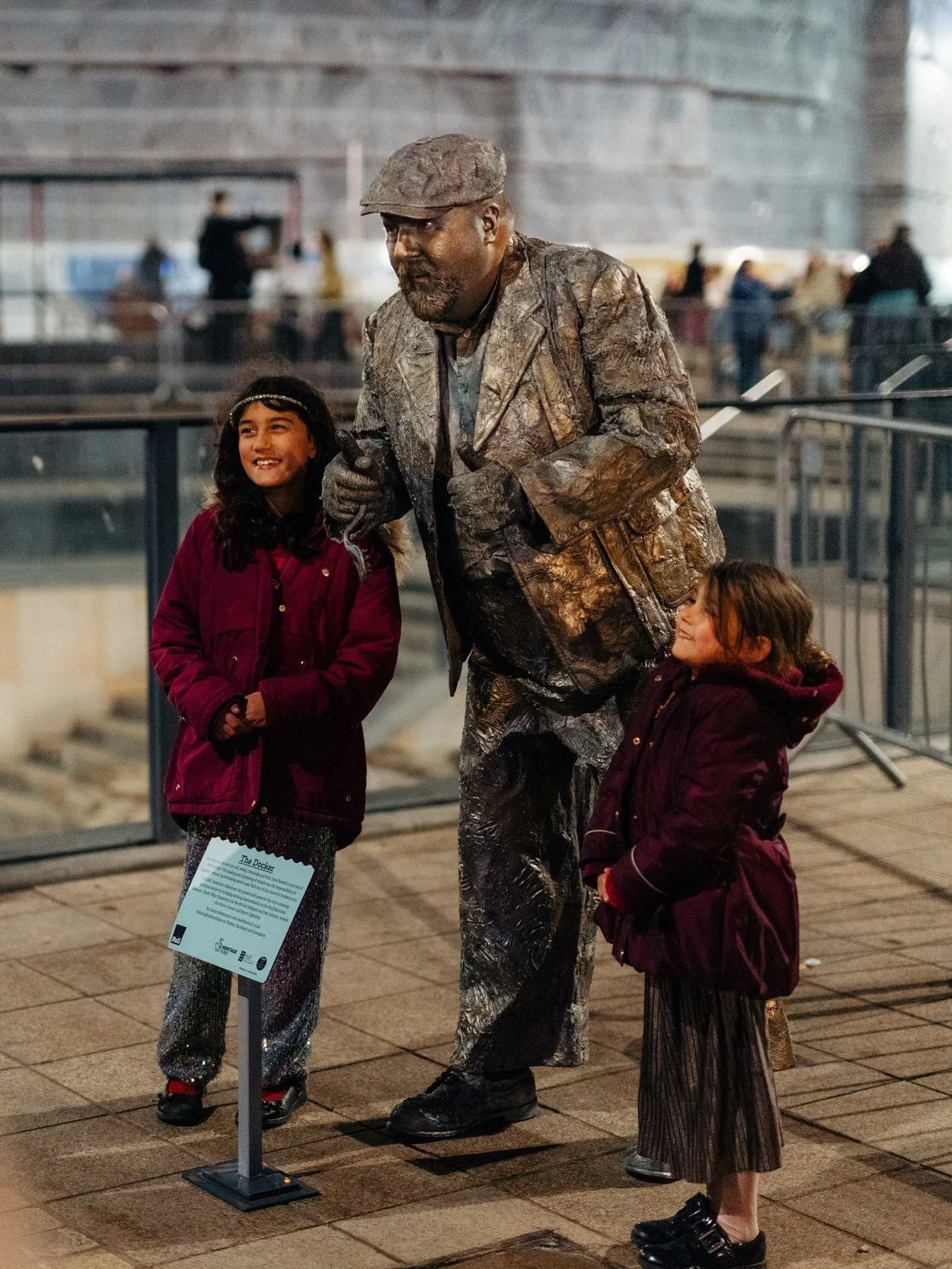 We move to join them, stepping in time with the beat they’re tapping out, trying to locate the source of the noise. Between the shoulders and arms and heads of people I see them: robotic toy soldiers, shimmering metallic, silver-sleeved, gathered, back-to-back, in a rotating circle. Their faces painted chalk-white with black flashes. Their volume increases, reverberating in my chest, as they spread out, towards the crowd, before throwing up their arms, a finale met with applause. A parting in the crowd through which they move off.