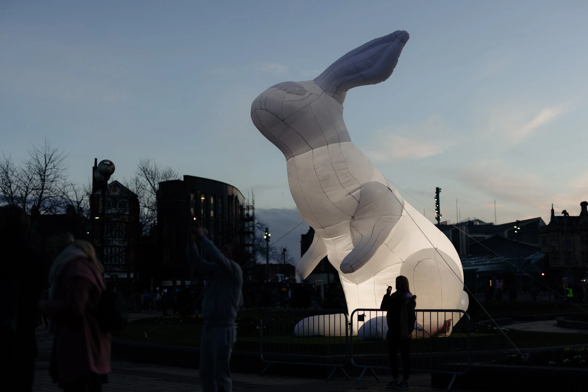 The Rose Bowl is really busy now, the three-thick queue stretching its whole circumference, and at the centre, standing sentinel around the fountain, are three white, inflatable rabbits, tall as buildings, like another vision from a dream. Or an omen. Or pagan guardians, pointing the way towards springtime.